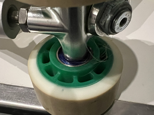 Haren op de vloer in de sporthal kunnen er voor zorgen dat de lagers moeilijker kunnen draaien en de assen beschadigen. Haal regelmatig de haren tussen de lagers weg, zo blijven de rolschaatsen prettig rijden.