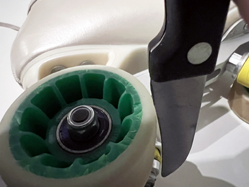 Vuil en/of stof op de vloer in de sporthal kunnen ervoor zorgen dat er een laagje op het loopvlak van jouw wielen komen. Dit kan er voor zorgen dat je minder grip hebt en kunt vallen. Met een aardappelschilmesje is dit vuil er eenvoudig vanaf te schrapen.